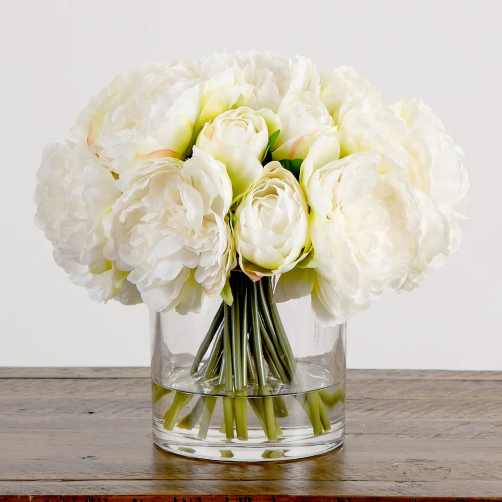 Peonies are known for their breathtaking beauty, but their short season can make them hard to enjoy year-round. This 11-In artificial Peony arrangement brings the elegance of peonies to your wedding tablescape, available in every season at a fraction of the cost. Inspired by nature, the intricate detailing of each bloom mirrors that of fresh peonies, ensuring a lifelike appearance. Standing gracefully in a clear glass vase filled with our proprietary fade-resistant Liquid Illusions, this stunning arrangement offers timeless beauty and a hassle-free, cost-effective solution for your wedding décor. Great for many styles and displaying beyond the big day.